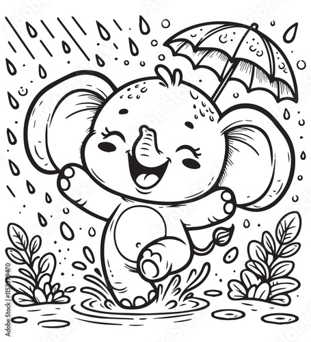 © agus, Obraz premium Coloring book cute elephant happy rain