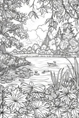 Fototapeta premium Coloring book illustration of a serene autumn landscape featuring a tranquil...