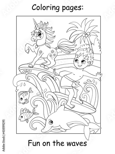 © alinart, Fototapeta premium Coloring book page boy and unicorn surf on the waves