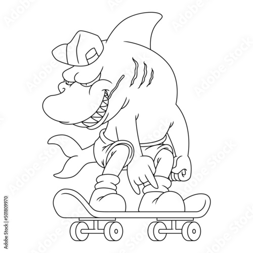 Obraz premium Coloring illustration of cartoon shark riding a skateboard