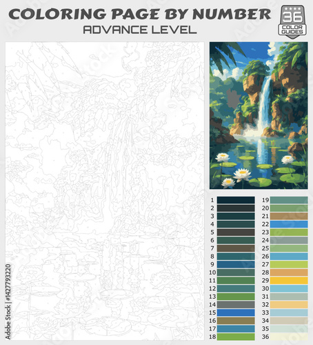 © OecupSaudagar, Fototapeta premium Coloring Page by Numbers – Tropical Waterfall and Lotus Pond (Advanced Level)