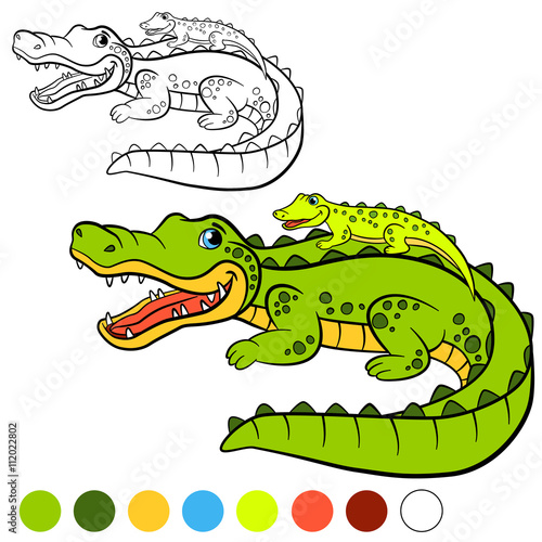 Obraz premium Coloring page. Color me: alligator. Mother alligator with her little cute...