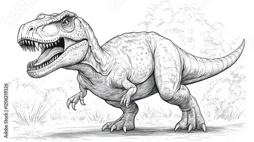 Naklejka premium Coloring page featuring a detailed sketch of a roaring T-Rex dinosaur...
