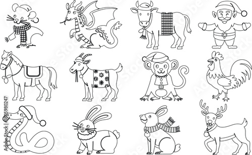 Fototapeta premium Coloring Page Featuring Twelve Cartoon Animals Dressed for Christmas and Winter Holiday Season