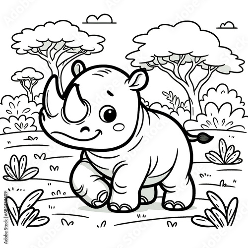 © Alejandro, Fototapeta premium Coloring page for kids featuring a playful Black Rhino in a savanna setting.