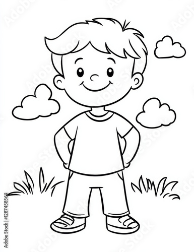 © EnelEva, Obraz premium Coloring page for kids featuring happy boy with clouds and grass
