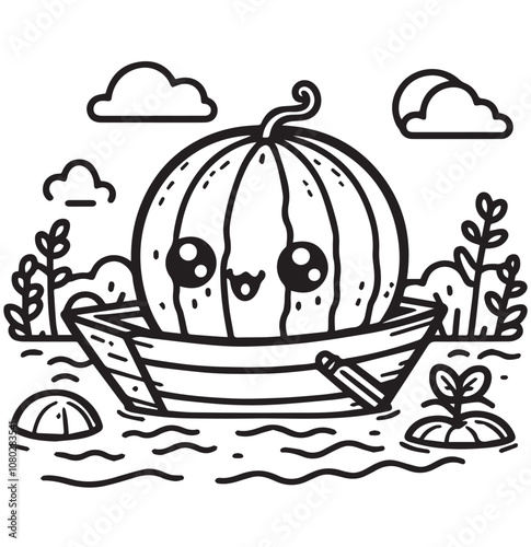 © agus, Fototapeta premium coloring page melon ride a small boat