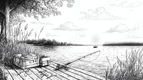 © kaiserseeing, Fototapeta premium Coloring page of Tranquil Fishing Scene by the Lake with Rod and Lure on Dock