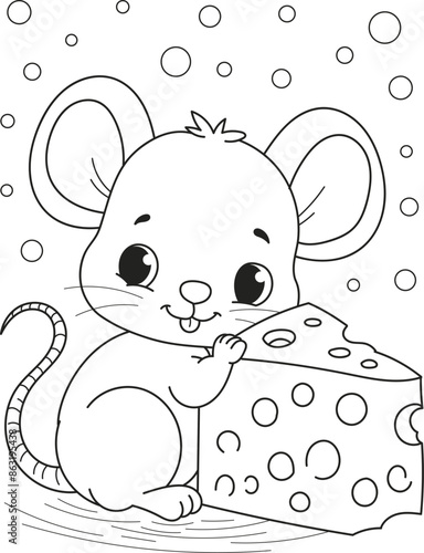 © Steiser, Obraz premium Coloring page outline of the cartoon smiling cute little mouse with cheese. Colorful vector illustration, summer coloring book for kids.