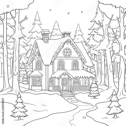 Obraz premium Coloring page with a house in the winter forest with a Christmas tree