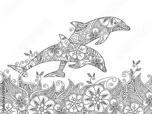 Obraz premium Coloring page with pair of jumping dolphins in the sea.
