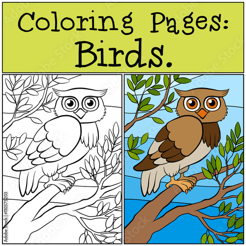 Fototapeta premium Coloring Pages: Birds. Little cute owl sits on the tree branch.