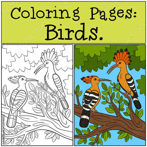 Obraz premium Coloring Pages: Birds. Two cute beautiful hoopoes smile.