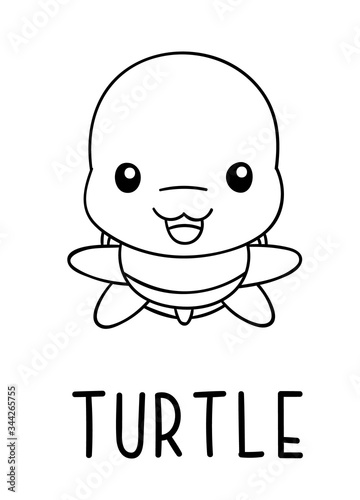Obraz premium Coloring pages, black and white cute kawaii hand drawn turtle doodles, lettering turtle