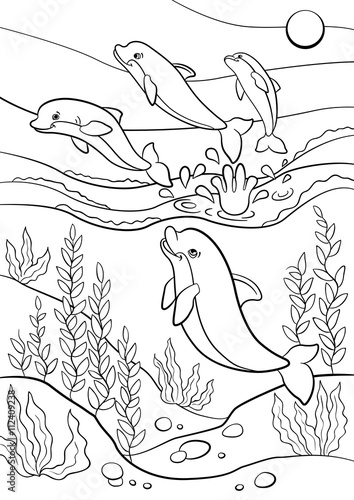 Obraz premium Coloring pages. Marine wild animals. Cute dolphins jumps out of the water and...