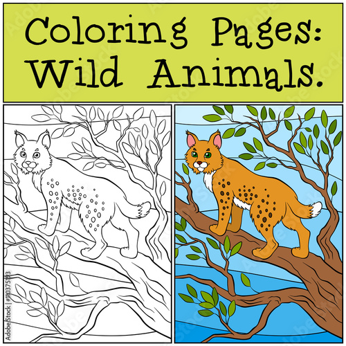 © ya_mayka, Fototapeta premium Coloring Pages: Wild Animals. Little cute lynx stands on the tre