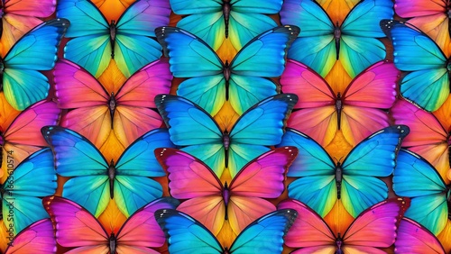 © StocksJust4You, Naklejka premium Colors of rainbow. Pattern of multicolored morpho butterflies with vibrant wings, arranged in seamless symmetry, creating a vivid texture background