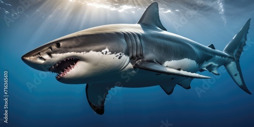 Fototapeta premium colossal great white shark, its obsidian form a fleeting predator against the azure canvas..