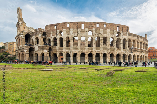 Fototapeta premium Colosseum, also known as the Flavian Amphitheater, commissioned in A.D. 70-72 by Emperor Vespasian, is the largest amphitheater ever built, made of concrete and sand. Rome, Italy