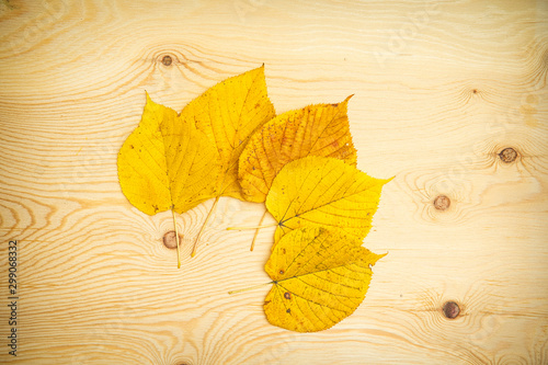 © Kseniia Burtseva, Obraz premium Colour autumn leaves on a wooden background