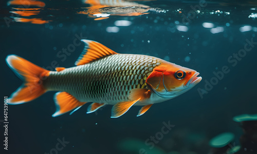 © ณรงค์วิทย์ สุขใจ, Naklejka premium Colour fish tossed above water surface Splash art water. AI generative.