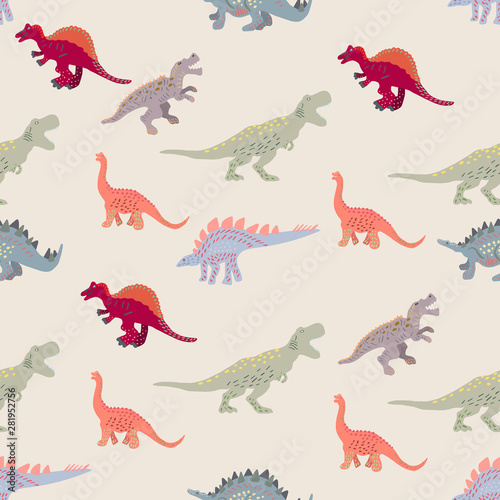 Obraz premium Coloured dinosaurs seamless pattern on light beige background