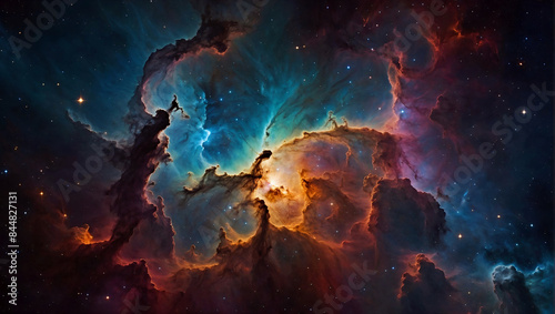 Fototapeta premium Colourful cloud nebula, galaxy, cosmic light and stars, space in the universe, astronomy, science, supernova, background, wallpaper.