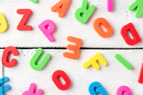 Obraz premium Colourful letters on white wooden background - pattern. School background