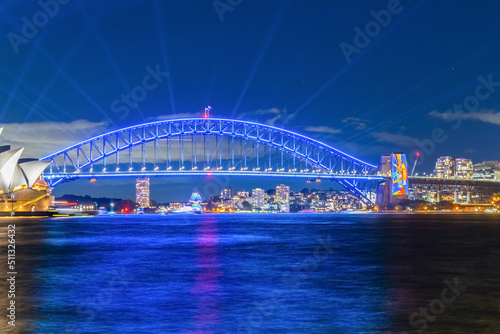 © Elias Bitar, Naklejka premium Colourful Light show at night on Sydney Harbour NSW Australia. The bridge illuminated with lasers and neon coloured lights