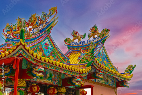 Naklejka premium Colourful multicoloured dragon on top of a temple in Patong Phuket Thailand....