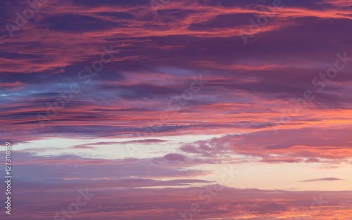 Fototapeta premium Colourful multicoloured romantic sunset sky with pink and magenta clouds. Beautiful fabulous purple cloudscape background