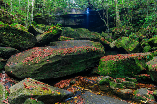 © Nakornthai, Fototapeta premium Colourful of maple leafs on the green rocks in autumn season in Phu-Kradueng national park , Thailand.