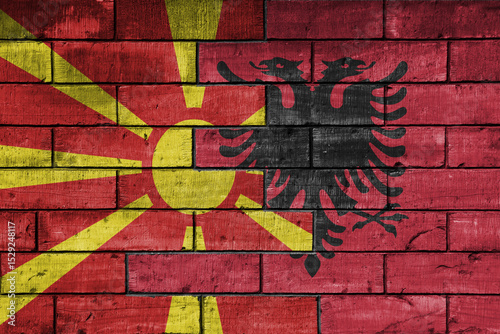 Fototapeta premium colourful painted big national flag of albania and flag of macedonia on a massive old brick wall background. concept