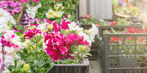 Fototapeta premium colourful pot plants blossom in boxes on flower shop desk