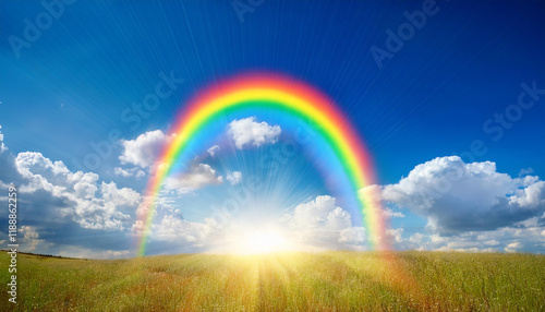 Naklejka premium colourful rainbow and sun rays on blue cloudy sky
