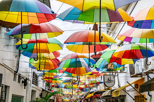 Fototapeta premium Colourful rainbow of umbrellas shade a laneway off Armenian St in George Town's heritage area.