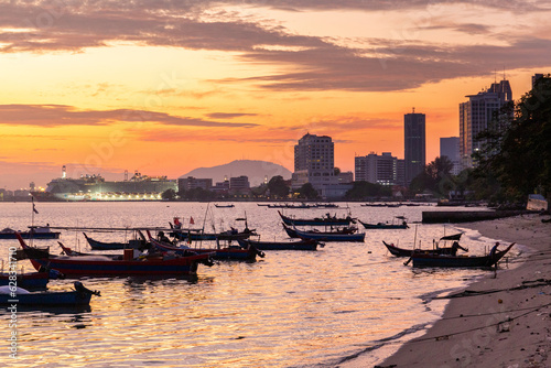 © yzhensiang, Fototapeta premium Colourful sunset sky over the sea with silhouette boat on the horizon. Tranquility scene. Abstract landscape background. Rural scene.