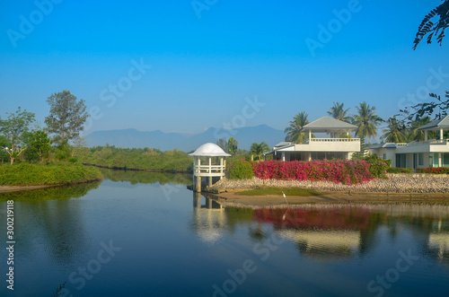 Obraz premium Colourful tropical buildings. Coastal landscape waterscape with
