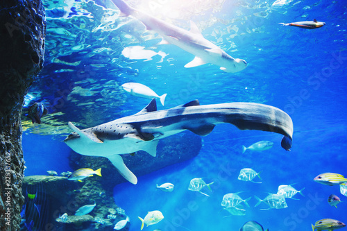 © olgasparrow, Fototapeta premium Colourfull fishes in dark blue water
