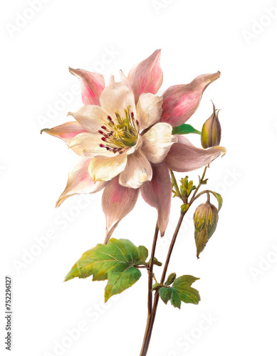 Fototapeta premium Columbine flower vintage illustration, botanical floral engraving style drawing isolated on white background, antique vintage book style flowers
