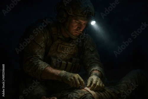 © Татьяна Евдокимова, Obraz premium Combat medic applying bandage to wounded soldier during a nighttime operation, using headlamp for illumination