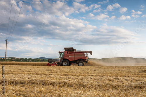 © ba11istic, Fototapeta premium Combine harvester agriculture machine harvesting golden ripe wheat field.