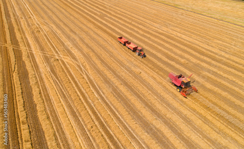 © Budimir Jevtic, Obraz premium Combine harvester and tractor with trailers in wheat field