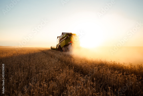 Naklejka premium Combine harvester at gold light in agriculture fields with wheat