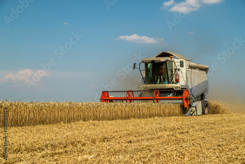 © oticki, Obraz premium Combine harvester at work under the clear blue sky during wheat harvest season