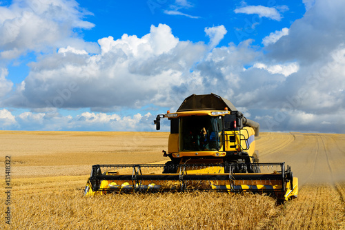 © AVTG, Obraz premium Combine Harvester Cutting Wheat, Summer Landscape of endless Fields under blue sky with clouds