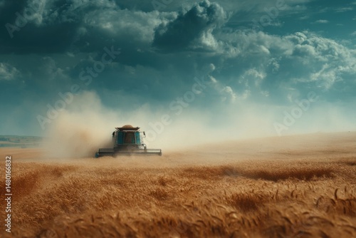 © PhotoProd, Fototapeta premium Combine Harvester Harvesting Grain Crop in Golden Field under Moody Sky for Agriculture Industry