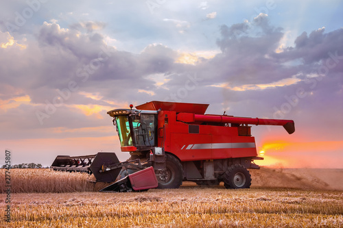 Fototapeta premium Combine harvester harvests in the field at sunset. Improved bright light, selective focus.