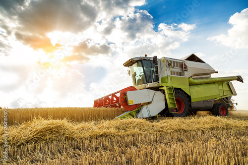 © oticki, Naklejka premium Combine harvester in action on wheat field