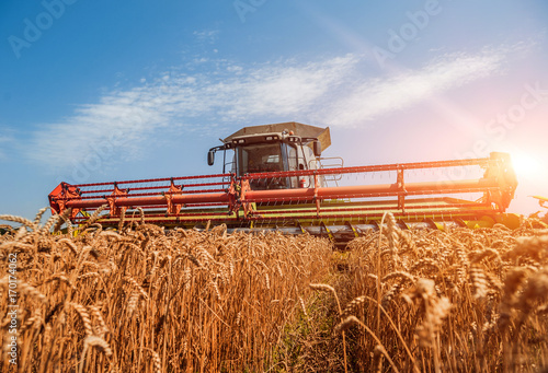 © romaset, Fototapeta premium Combine harvester in action on wheat field. Process of gathering a ripe crop.